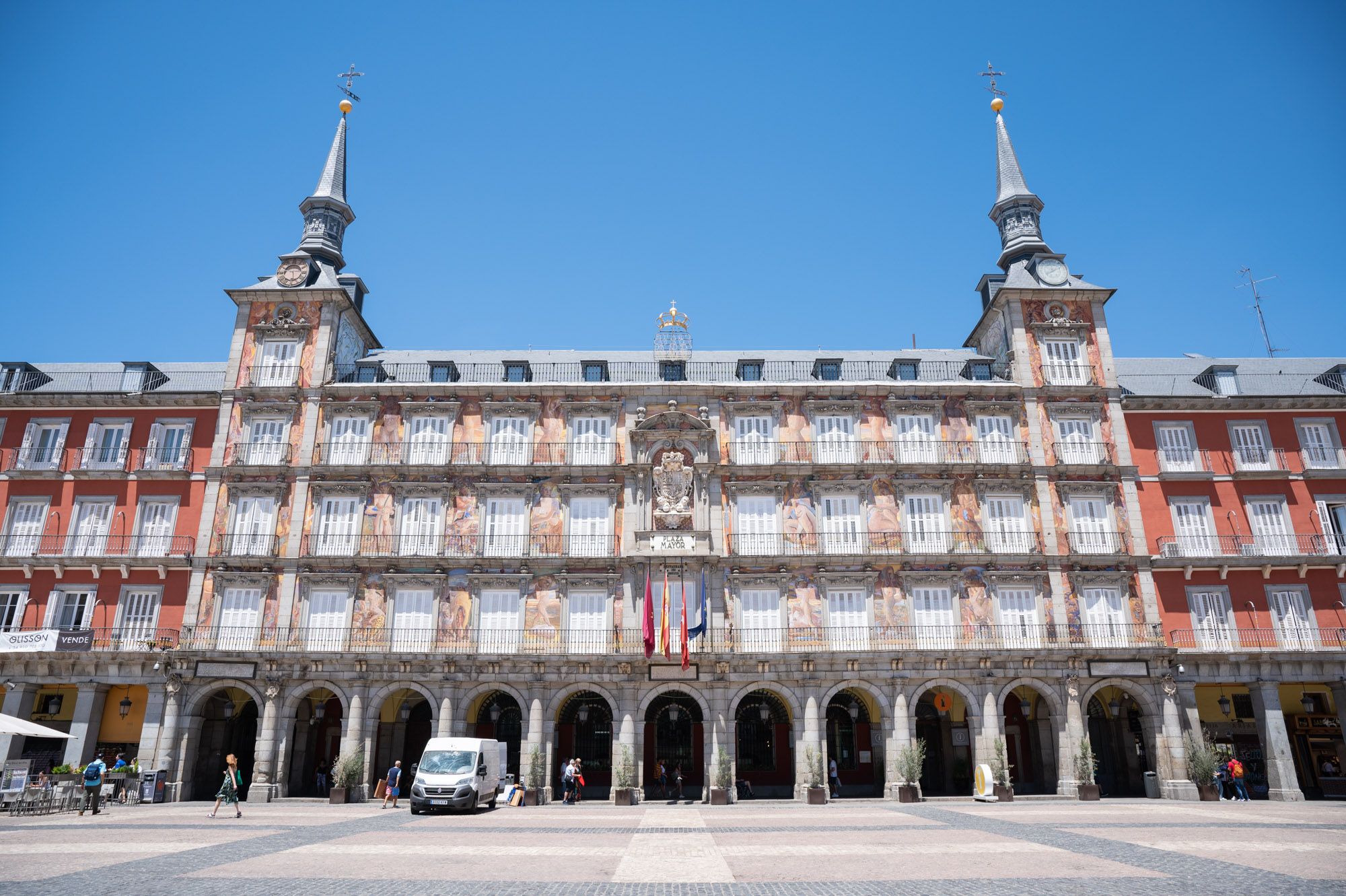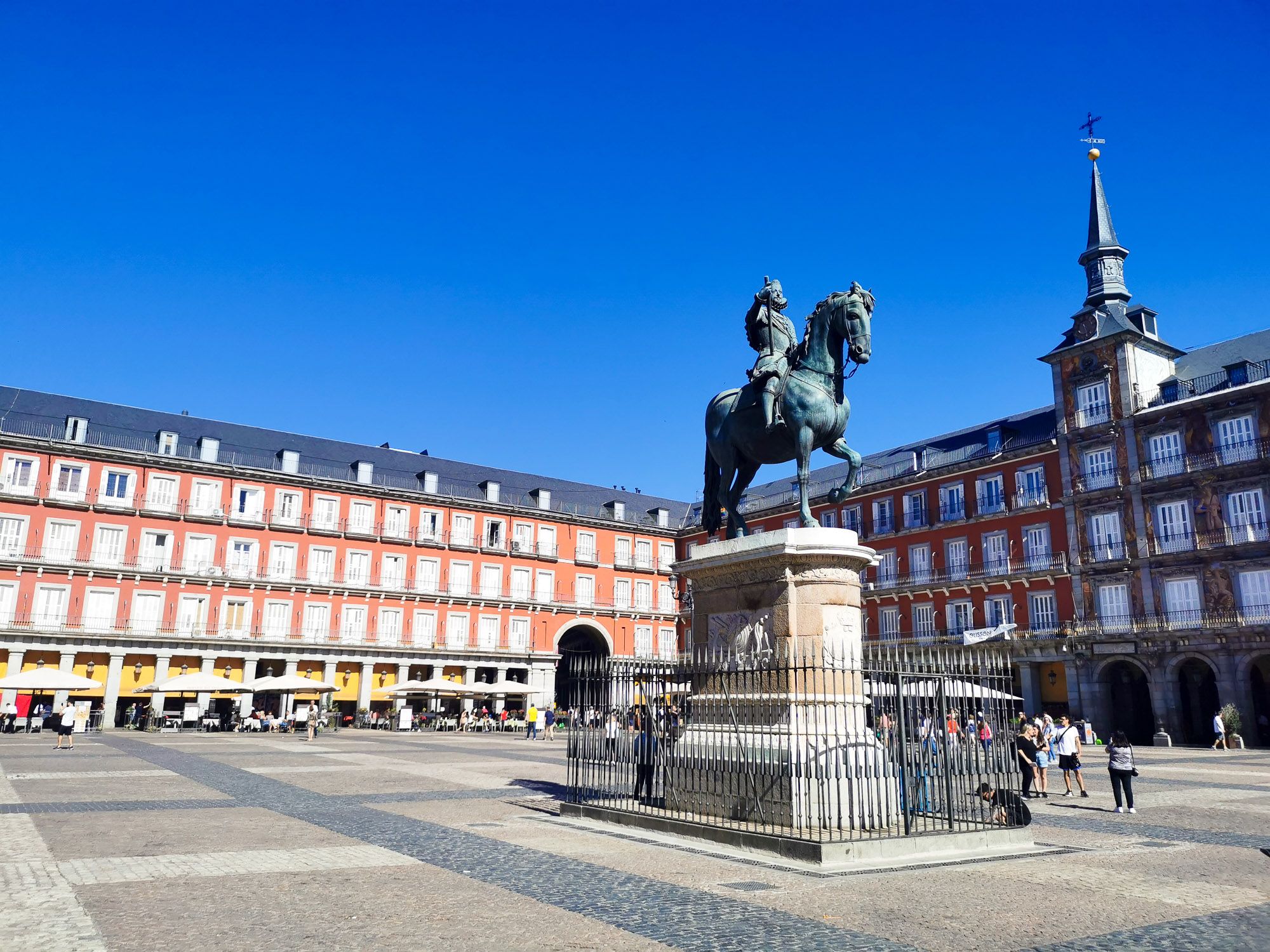 จุดต่อมาที่น่าสนใจ คือ Plaza Mayor เป็นพลาซ่าขนาดใหญ่ที่มีตึกล้อมรอบ เป็นจุดศูนย์กลางของเมืองเก่าในมาดริด เมื่อก่อนเป็นตลาดสดมาก่อน ต่อมาเมื่อ พระเจ้า Philip II ย้ายเมืองมาก็มีการปรับปรุงให้พื้นที่นี้ให้กลายเป็นจุดศูนย์กลางประจำเมือง แต่อนุสาวรีย์ตรงกลางกลับเป็นของพระเจ้า Philip III