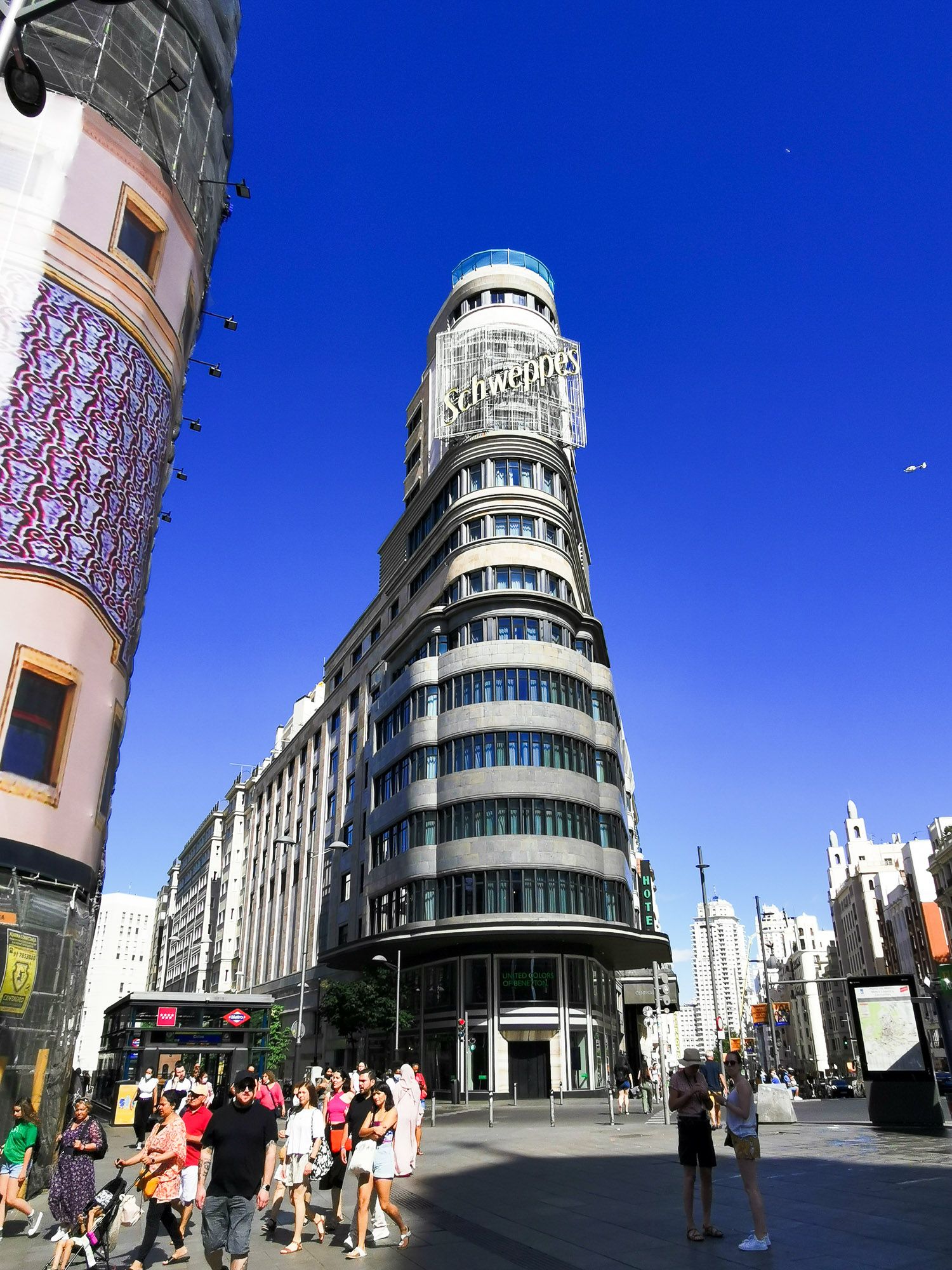 สำหรับที่มาดริด เราก็ไปร่วมกับ Free Walking Tour ซึ่งเริ่มต้นที่สถานีเมโทร Callao ซึ่งเป็นย่าน Gran Vía ย่านช้อปปิ้ง และมีตึกที่มีป้าย Schweppes เป็นป้าย iconic ของเมืองมาดริด จริง ๆ แล้ว ตึกชื่อ Edificio Carrión ป้ายนี้อยู่คู่กับตึกนี้มาตั้งแต่ปี 1972 ดูไปก็คล้าย ๆ กับย่าน Time Square ของนิวยอร์ค