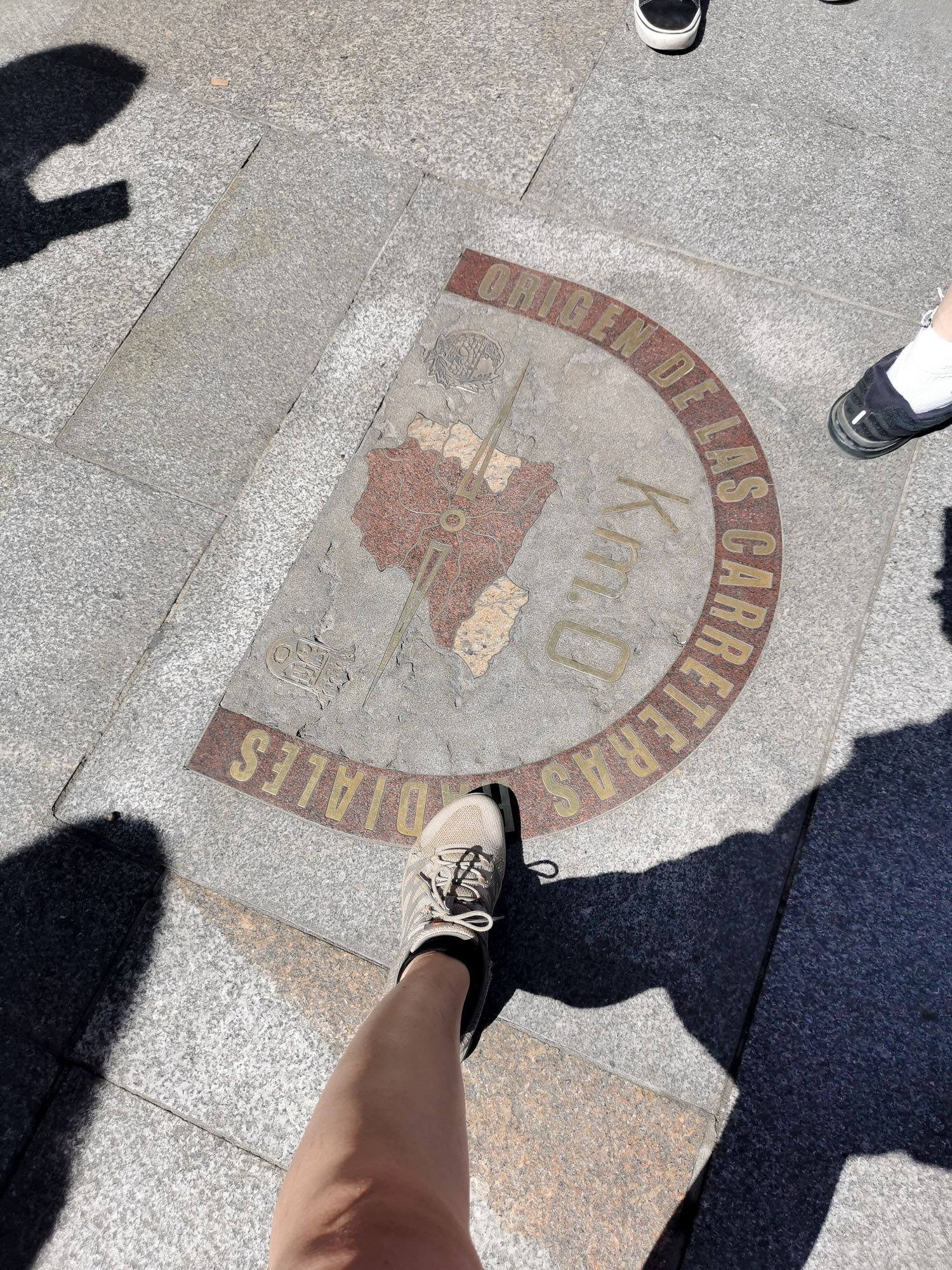 ไกด์พาเราเดินไปเริ่มต้นทัวร์ที่ Puerta del Sol ซึ่งเป็นจุดที่นับเป็นศูนย์กลางของเมือง มีป้ายกิโลเมตร 0 อยู่ ซึ่งไกด์เล่าว่าหากไปยืนบนป้ายสองขา จะได้มาอยู่ที่มาดริด หากไปยืนเหยียบป้ายขาเดียว จะได้กลับมาที่มาดริดอีกครั้ง