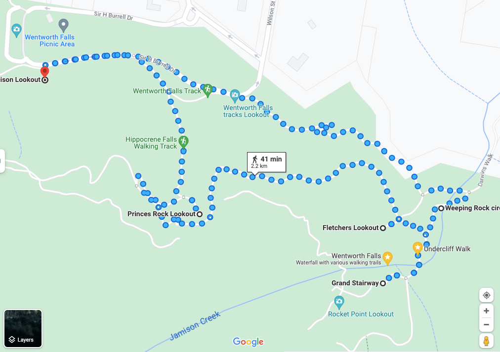 เริ่มต้นแทร็กที่ Jamison Lookout เดินไปทาง Wentworths Falls Track เดินลงมาที่ Princess Rock Lookout ตรงนี้บันไดลงยาว ๆ